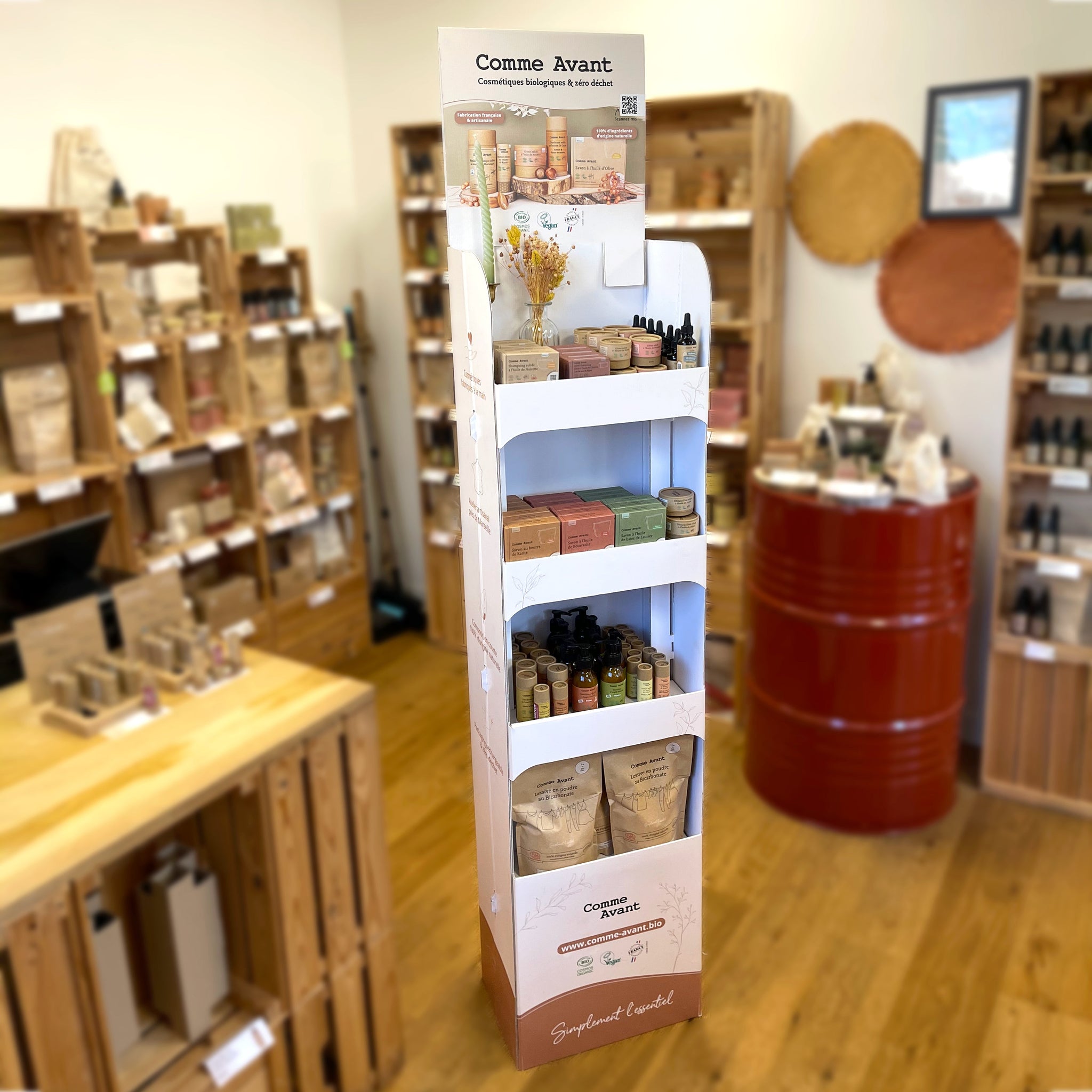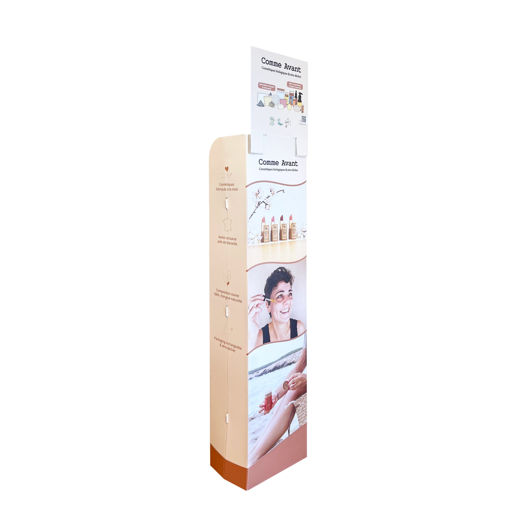 Avec ses dimensions de 37 x 25,7 x 187 cm (avec fronton) et 37 x 25,7 x 152 cm (sans fronton), cette PLV optimise l’exposition tout en restant compacte et fonctionnelle. Fabriquée en France avec une double micro-cannelure, elle garantit une stabilité renforcée pour un support fiable et durable.